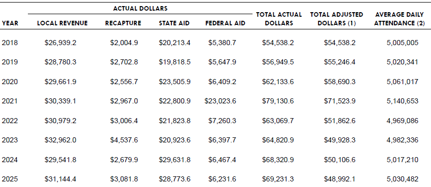 This author cannot read the minds of those responsible for publishing the Fiscal Size-up. However, the most obvious reason is to make it appear as if adjusted public education funding was decreasing. Though Texas’ population increased by about 9.5% from 2019 to 2025, the average number of students in Texas schools increased by only 2.02% (see the Average Daily Attendance figures in the LBB’s chart above). Using the population growth figures greatly distorts the LBB’s adjusted dollars.
